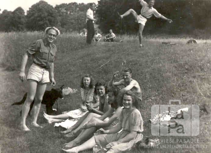 Roveri un lielgaidas no Centrālās nometnes Vircburgā (amerikāņu zonā) ar suni pļavā Jāņu laika izpriecas izbraukumā. Fonā mežs. Pirmais no kreisās: Fricis Sīpols (ar vainagu galvā). Foto autors: Guntis Kuškēvics.