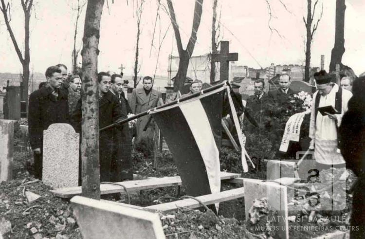 Cilvēku grupa kapsētā Vircburgā (amerikāņu zonā) Ziemeļu nometnes, Dundagas 54. skautu vienības rovera bērēs. Viens vīrietis pāri kapam tur Latvijas karogu. Kapa labajā pusē, galvu noliecis, stāv priesteris tērpā un ar grāmatu rokās. Apkārt redzami kapu krusti un koki. Otrais no labās : ? Grosbachs (priestera tērpā).