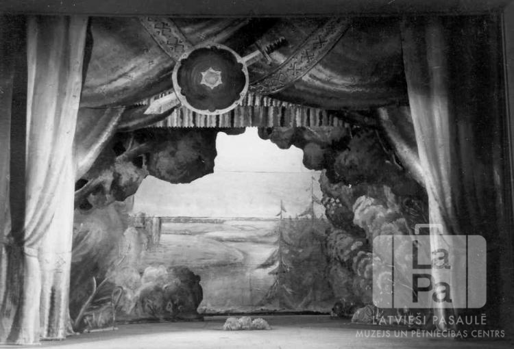 Skatuves iekārtojums Mirdzas Timmas lugai "Karoga Teiksma" Centrālajā nometnē Vircburgā (amerikāņu zonā). Attēlota meža ainava ar kokiem un krūmiem. Virs skatuves piestiprināts vairogs ar zobenu.