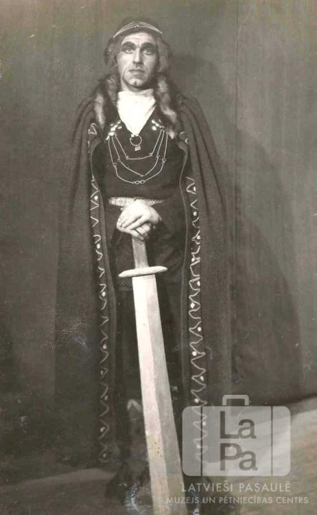 Režisors un "Drūmā virsaiša" tēlotājs, vadītājs Fricis Sīpols kostīmā ar skatuves zobenu Mirdzas Timmas lugā "Karoga Teiksma" Centrālajā nometnē Vircburgā (amerikāņu zonā).