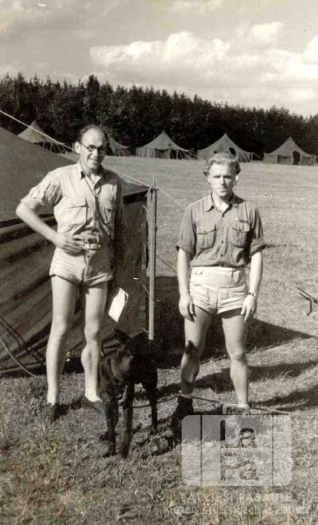 Divi vīrieši un suns no Centrālās nometnes Vircburgā (amerikāņu zonā) 1947. gada vasarā stāv pie telts. Nometni rīkoja organizācija "YMCA", un tā atradās pie Fahra-Mainas upes līča. Fonā laukums, telšu rinda un egļu mežs. No kreisās: Fricis Sīpols (nometnes padomnieks), suns Reksis, nezināms (audzinātājs, Vircburgas rovers).