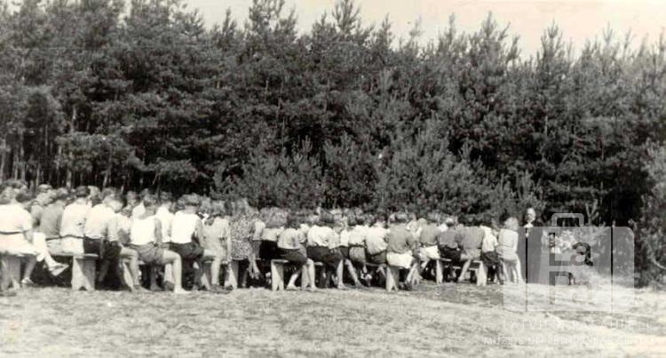Liela cilvēku grupa sēž uz soliem vairākās rindās brīvdabas dievkalpojumā bērnu nometnē 1947. gada vasarā. Nometni rīkoja organizācija "YMCA", un tā atradās pie Fahra-Mainas upes līča. Nometnē piedalījās arī dalībnieki no Centrālās nometnes Vircburgā (amerikāņu zonā). Aiz cilvēkiem egļu mežs. Pirmais no labās: mācītājs ? Grauds (mācītāja tērpā).