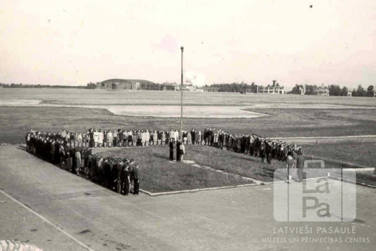 Cilvēku grupa stāv ierindā ap karoga mastu liela lauka malā bērnu nometnē "Giebelstadt" lidlaukā 1948. gada vasarā. Nometni rīkoja organizācija "YMCA", un tajā piedalījās arī dalībnieki no Centrālās nometnes Vircburgā (amerikāņu zonā).