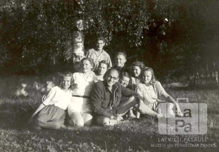 Latviešu audzinātāji pie bērza bērnu nometnē "Giebelstadt" lidlaukā 1948. gada vasarā. Nometni rīkoja organizācija "YMCA", un tajā piedalījās arī dalībnieki no Centrālās nometnes Vircburgā (amerikāņu zonā). Pirmajā rindā, trešais no kreisās: Fricis Sīpols (programmas vadītājs).