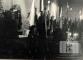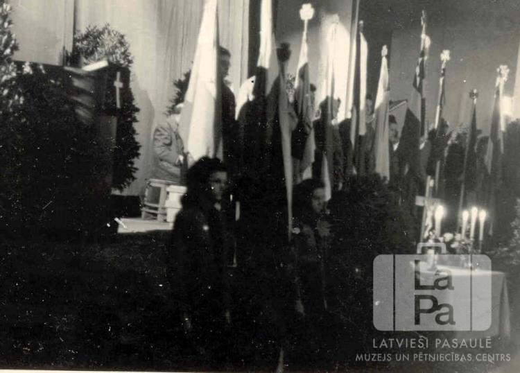 Cilvēki ar karogiem stāv rindā uz paaugstinājuma Centrālajā nometnē Vircburgā (amerikāņu zonā). Starp karogiem redzams Latvijas karogs. Priekšplānā divas jaunietes stāv ierindā, labajā pusē galds ar svecēm un krustu.