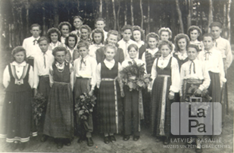 Cilvēku grupa tautastērpos Jāņu svinībās Saules nometnē Gēsthahtā (angļu zonā). Četriem cilvēkiem rokās ir vainagi. Fonā neliels mežs, caur kuru redzama vienstāvu koka baraka. Pirmajā rindā, no kreisās: Mirdza Eglīte, Ivars Alberts, Gaisma Kovala (pr. Newman), Raitis Otto, Ināra Ošiņa, Nikolājs Džansons, Benita Runde, Harijs Laķis un Gunārs Pētersons. Otrajā rindā, no kreisās: Zigis Otto, Rasma Valdmane, Valda Pavasare, nezināms, Zaiga Sproģe, Gaida Lūkina, skolotāja ? Akmentiņa, Ivars Amtmanis, Vija Balode, Ruta ?, nezināms, Vija Martinsone, nezināms un Juris Zirdziņš. Aizmugurē Juris Zemītis un Andrejs Ginters.