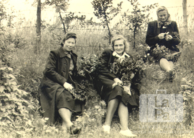Trīs sievietes ar puķēm klēpī sēž zālē pie Saules nometnes Gēsthahtā (angļu zonā) ap 1948. gadu. Aizmugurē dzeloņstiepļu žogs. Priekšā, otrā no kreisās: Anna Kovals.
