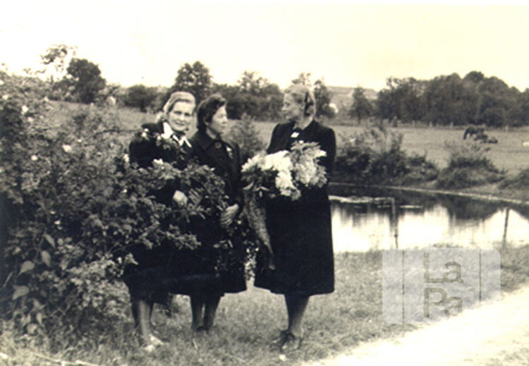 Trīs sievietes no Saules nometnes Gēsthahtā (angļu zonā) stāv zālē ap 1948. gadu. Priekšplānā, labajā pusē, zemes taka, kreisajā pusē krūms, fonā ūdenstilpe, aiz tās lauks un mežs. Pirmā no kreisās: Anna Kovals. Par šo gadījumu Gaisma Kovals Newman atceras: "Elbas upe, tās krasti un visa Gēsthahtas apkārtne bija ļoti skaista. Mēs bieži gājām upē peldēties."