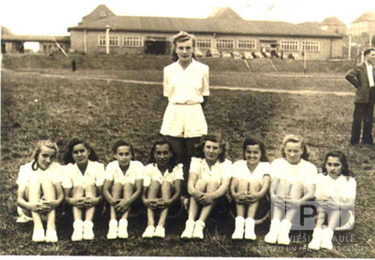 Meiteņu grupa sporta svētkos Neištatē (Holšteinā, angļu zonā). Astoņas meitenes baltos sporta tērpos sēž zālē viena otrai blakus. Aiz viņām stāv meitene baltā sporta tērpā. Fonā, labajā pusē, stāv viens vīrietis; pāri laukam, uz nelielas nogāzes, vienstāvu mūra ēka. Aizmugurē: Gaisma Kovals (pr. Newman).