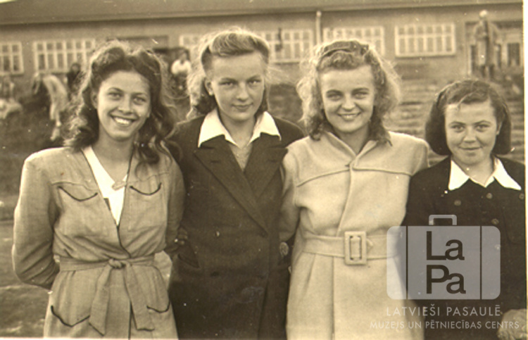 Četras jaunietes Neištates nometnē (Holšteinā, angļu zonā). Fonā cilvēki un vienstāvu mūra ēka. No kreisās: otrā Gaisma Kovals (pr. Newman), ceturtā Vija Kalniņa.