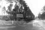 Asfaltēta ceļa skats ar zīmi uz Fišbahas nometni (amerikāņu zonā). Uz zīmes rakstīts: "FISCHBACH / D.P. CENTER". Aiz tās ceļa malā priežu mežs. Vietām gar ceļa malām un mežā redzams sniegs.