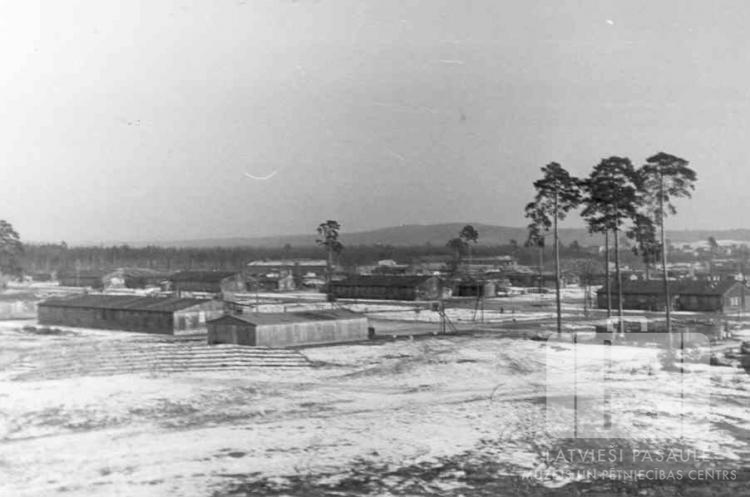 Skats uz Fišbahas nometni (amerikāņu zonā). Priekšplānā liels laukums, aiz tā vienstāvu koka barakas un vietām retas priedes. Aiz nometnes tālumā redzams mežs. Zeme ir klāta ar sniegu.