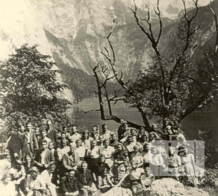 Jaunieši no Kārļa Skalbes ģimnāzijas Fišbachas nometnē (amerikāņu zonā) ekskursijā Bavārijas Alpu kalnos. Fonā liela ūdenstilpe un sniegoti kalni.