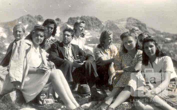 Skolēni ar skolotāju no Kārļa Skalbes ģimnāzijas Fišbachas nometnē (amerikāņu zonā) ekskursijā Bavārijas Alpu kalnos. Fonā kalnu virsotnes. No kreisās: Anna Reščevska (skolotāja), Ārija Draviņa, Dzidra Strautiņa, Pēteris Lielzuika, Līvija Duka, Valda Brože, Biruta Rolle un nezināms.