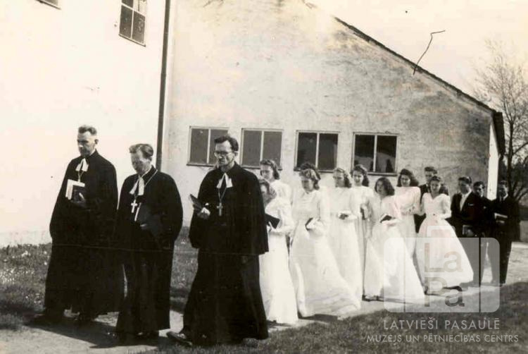 Mācītāji pa taku ieved iesvētāmos jauniešus Fišbahas ciema baznīcā (amerikāņu zonā). Meitenēm gaišas kleitas, puišiem uzvalki. Visiem rokās ir grāmatas. Priekšējā rindā, no kreisās: mācītāji Alfrēds Gulbis, Valdemārs Strautmanis un Frīdrichs Kramiņš. Aiz mācītājiem redzami: Gaida Dumpe, Dzidra Robiņa, Ārija Draviņa, Līvija Norgello, Gatis Avotiņš un Edmunds Mednis.