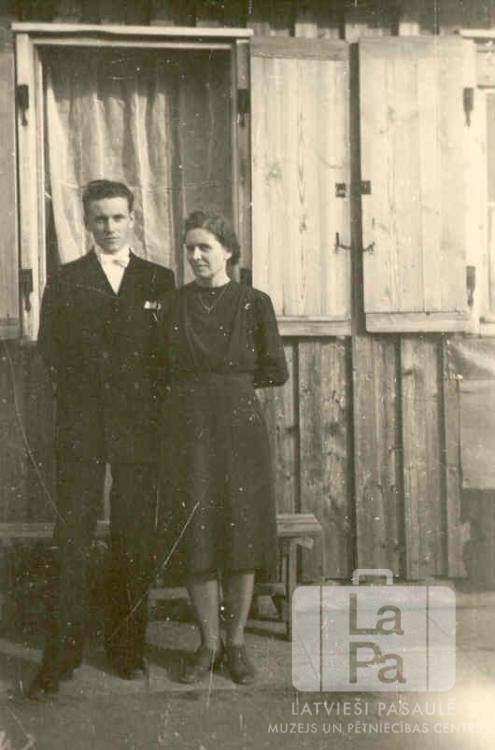 Gatis Avotiņš ar māti Mildu Zvaigzni savās iesvētībās pie koka barakas loga Fišbahas nometnē (amerikāņu zonā).