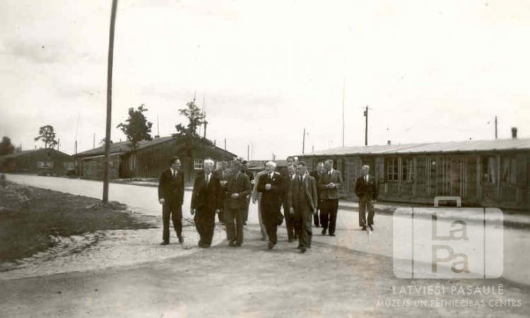 Vīriešu grupa pastaigājas pa ielu Fišbahas nometnē (amerikāņu zonā) Latvijas evaņģēliski luteriskās baznīcas virsgana, arhibīskapa prof. Dr. theol. Teodora Grīnberga vizītes laikā. Ielas labajā pusē redzamas vienstāvu koka barakas. Grupā redzami: Frīdrichs Kramiņš (mācītājs), Voldemārs Vārpa, Teodors Grīnbergs (archibīskaps), Valdemārs Strautnieks (mācītājs) un Alfrēds Gulbis (mācītājs).