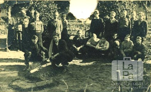 Skauti formastērpos no Vīsbādenes nometnes (amerikāņu zonā) Frankfurtē 1945. gada rudenī. Aizmugurē apstādījumi un koki.