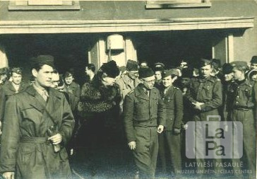 Cilvēku grupa pie ēkas Vīsbādenē (amerikāņu zonā). Liela daļa ir vīriešu armijas formastērpos. Priekšā, otrā no kreisās: Eleonora Rūzvelta (melnā mētelī ar kažokādas apkakli). Foto autors: ASV armijas fotogrāfs.
