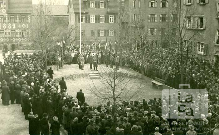 Liels cilvēku pūlis ir sapulcējies pie karoga masta Vīsbādenē (amerikāņu zonā). Iespējams, tas ir Eleonoras Rūzveltas apmeklējuma laikā. Pūļa vidū ir tukšs laukums, tā malā ir redzami vairāki Latvijas valsts karogi. Apkārt ir vairākstāvu dzīvojamās ēkas. Foto autors: ASV armijas fotogrāfs.
