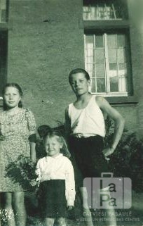 Strautnieku ģimenes bērni pie mūra ēkas loga Vīsbādenē (amerikāņu zonā). No kreisās: Daina Strautniece, nezināms, Gunārs Strautnieks. Foto autors: Genis Zelčs. Par šo gadījumu Genis Zelčs atceras: "Brālis un māsas stāv pie logiem, kur viņi dzīvoja Vīsbādenē. Mazā meitene man dod puķes, patiesībā kādus zarus, kuri izskatās kā puķes, par fotogrāfēšanu."