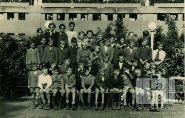 Pamatskolas skolēni Vīsbādenes nometnē (amerikānu zonā). Aiz skolēniem ielas laterna staba galā un ar vīteņaugiem apaugusi mūra ēka. Ceturtajā rindā, no kreisās: sestais Genis Zelčs, desmitais Geralds Tenisons. Par šo gadījumu Genis Zelčs atceras: "Tie ir visi Vīsbādenes pamatskolas skolnieki. Kā redzams, viņu drēbes ir pārāk mazas, jo tās bija tās pašas, kuras valkāja Latvijā. Drīz ASV sāka sūtīt kādas vecas drēbes un citas vajadzīgas lietas. Pirms mēs atstājām to nometni, skola izskatījās pēc skolas. Bija dažas grāmatas, rakstu lietas, un skolotāji paši bija iemācījušies, kā uzvesties un ko mācīt."