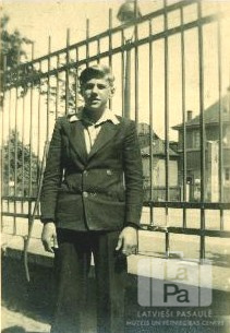 Zēns uzvalkos pie metāla žoga Vīsbādenes nometnē (amerikāņu zonā). Cauri žogam redzama divstāvu mūra ēka. Foto autors: Genis Zelčs. Par šo gadījumu Genis Zelčs atceras: "Ezis bija viens no maniem labākajiem draugiem Vīsbādenē, bet neatceros viņa krustīto vārdu. Pie Vīsbādenes žoga iekšpusē."