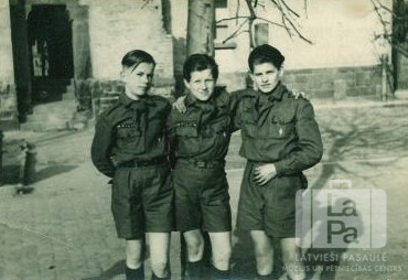 Trīs skauti formastērpos mūra ēkas priekšā Vīsbādenes nometnē (amerikāņu zonā). No kreisās: pirmais Geralds Tenisons, trešais Genis Zelčs.