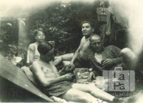 Trīs vīrieši un zēns guļ zālē meža vidū pie Vīsbādenes nometnes (amerikāņu zonā). Kreisajā pusē redzama telts siena. Vienam vīrietim rokās ir kārtis. Aizmugurē, no kreisās: Gunārs Strautnieks, Edgars Strautnieks. Foto autors: Genis Zelčs. Par šo gadījumu Genis Zelčs atceras: "Pēc gara ceļojuma pa dabu, kur kājas bija vienīgais transporta līdzeklis, skautu vadītāji atpūšas ārpus telts siltā vasaras dienā un izklaidējas ar kāršu spēlēšanu."