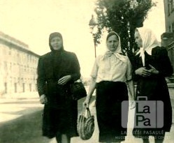 Trīs sievietes iet pa ielu Vīsbādenes nometnē (amerikāņu zonā). Visām uz galvas ir lakati, divām rokās ir rokassomas. Fonā bruģēta iela un vairākstāvu mūra ēkas. Pirmā no kreisās: Zofija Zelčs. Foto autors: Genis Zelčs.