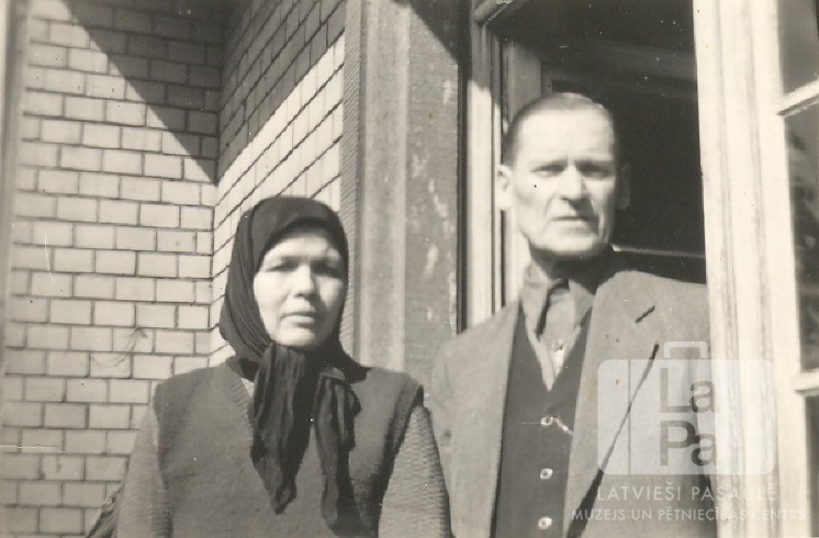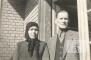Zelču ģimenes pāris Manheimā (amerikāņu zonā). No kreisās: Zofija Zelčs un Vincents Zelčs. Fonā, kreisajā pusē, ķieģeļu siena. Labajā pusē logs un durvis, kurās stāv V. Zelčs. Foto autors: Genis Zelčs.
