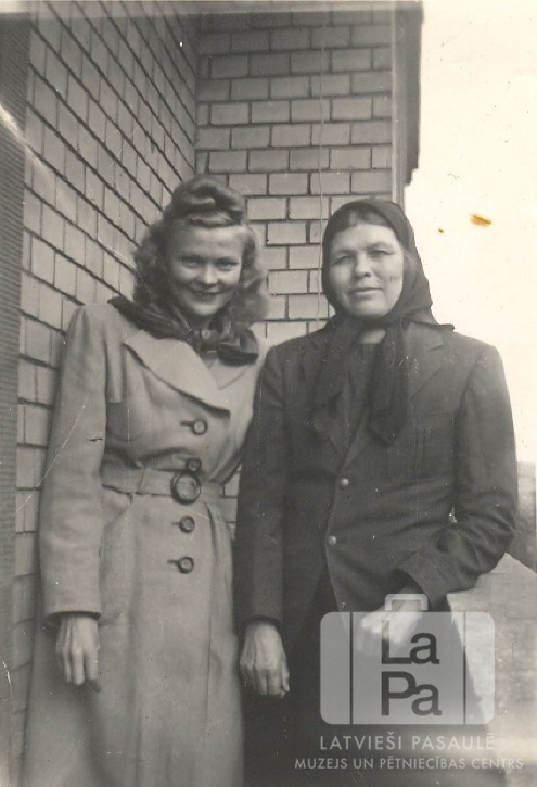 Divas sievietes Manheimā (amerikāņu zonā). Aizmugurē balkona ķieģeļu sienas stūris. No kreisās: Marija Garbāns un Zofija Zelčs. Foto autors: Genis Zelčs.