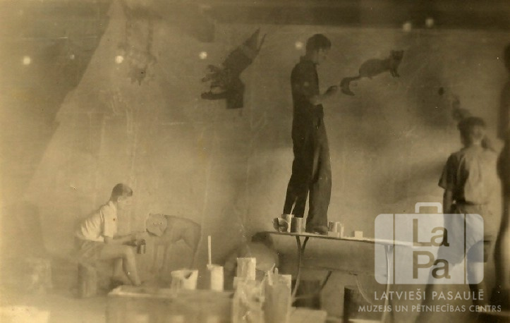 Trīs zēni krāso sienu Manheimas nometnē (amerikāņu zonā). Vidū zēns ir pakāpies uz šaura galda. Uz sienas ir redzami krāsoti dzīvnieki. Telpā ir vairākas papīra turzas un bundžas. No kreisās: otrais Genis Zelčs (uz galda), trešais "Ezis" (īstais vārds nezināms).