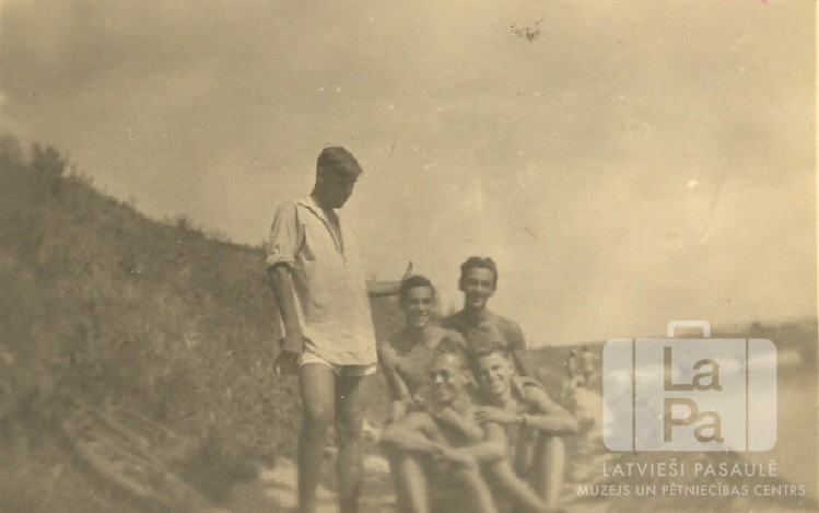 Pieci jauni vīrieši no Manheimas nometnes (amerikāņu zonā) upes krastā 1948. gada vasarā. Kreisajā pusē nogāze, aiz vīriešiem tālumā redzami divi cilvēki. Foto autors: Genis Zelčs. Par šo gadījumu Genis Zelčs atceras: "Jaunieši iet peldēties Reinas upē (Rhein). Bija grūti peldēties tajā upē, jo tai bija ļoti stipra straume. Bet vismaz vasaras vidū varēja kādu brīdi atvēsināties."