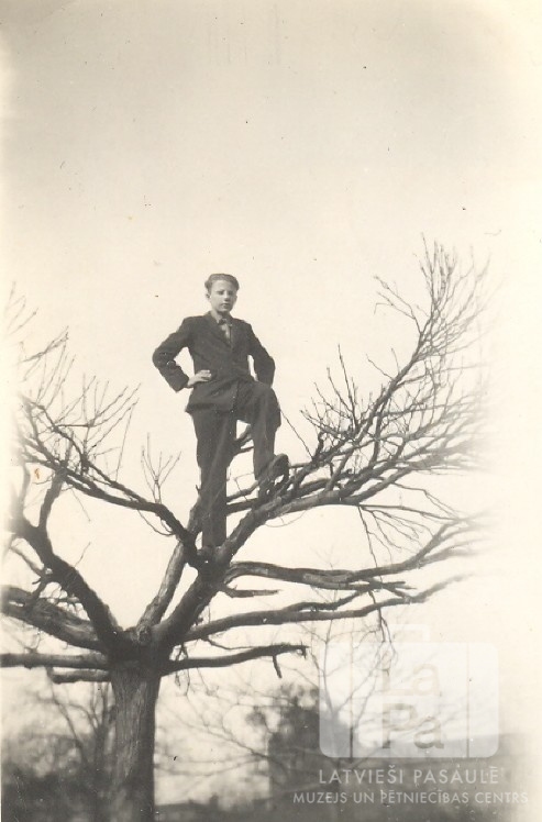 Viktors Naruns koka galotnē pie Manheimas nometnes (amerikāņu zonā) 1948. gada rudenī. Foto autors: Genis Zelčs. Par šo gadījumu Genis Zelčs atceras: "Viktors Naruns tajā pašā parkā grib lielīties, cik augsti viņš var uzkāpt kokā un nenokrist – pierādot, ka viņam nav bailes. Ha!"