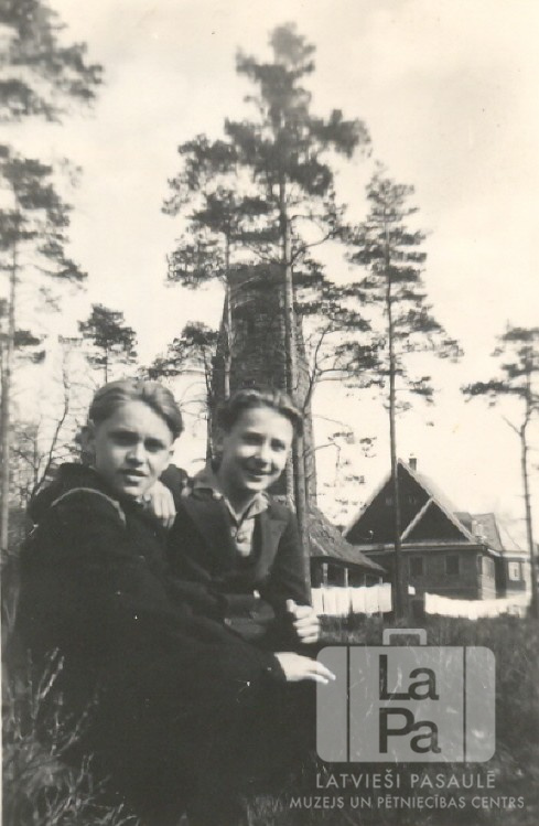 Divi zēni no Manheimas nometnes (amerikāņu zonā) sēž zālē. Fonā priedes un vairākas ēkas. No kreisās: Edvīns (Otto) Tums, Juris Lecis. Foto autors: Genis Zelčs.