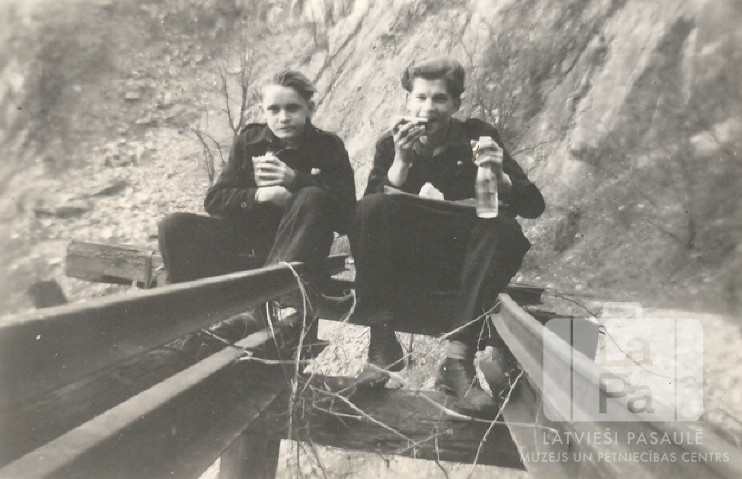 Divi zēni no Manheimas nometnes (amerikāņu zonā) sēž uz sliedēm un ēd maizi. Zem sliedēm redzami koka balsti. Fonā stāvas nogāzes siena. No kreisās: Edvīns (Otto) Tums, Genis Zelčs (ar pudeli rokās).