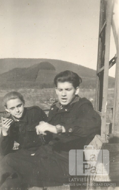 Divi zēni no Manheimas nometnes (amerikāņu zonā) sēž uz sola. Viens zēns skatās rokas pulkstenī. Labajā pusē redzama dzelzs konstrukcija. Fonā ielejas ainava ar kalnu otrā pusē. No kreisās: Edvīns (Otto) Tums, Genis Zelčs.