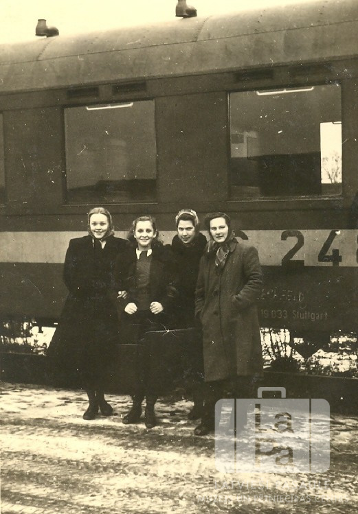 Četras sievietes mēteļos pie vilcienu vagona Manheimā (amerikāņu zonā). Sievietēm labajā pusē uz vagona ir skaitlis 24. No kreisās: Valda Naruns, Dagnija Antmanis, Ruta Miķelsons un Inese Kalniņš. Foto autors: Genis Zelčs.