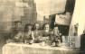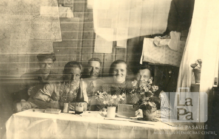Pieci cilvēki sēž pie galda Fišbahas nometnē (amerikāņu zonā). Uz galda puķes vāzēs un puķupodā, kā arī vīna pudele. Labajā pusē logs ar puķupodu. Aizmugurē koka dēļu siena. No kreisās: Genis Zelčs, Vitālijs Pundurs, nezināms, Lidija Pundurs un ? Pundurs. Foto autors: Genis Zelčs.