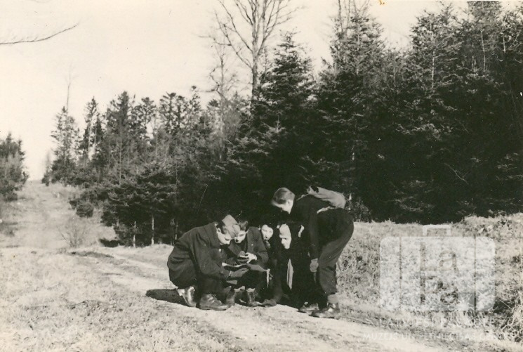 Pieci zēni no Švābu Gmindes nometnes (amerikāņu zonā) ir notupušies uz meža ceļa un skatās kādā dokumentā. Fonā, ceļa labajā malā, jauns egļu mežs. No kreisās: pirmais ? Bins, otrais Viktors Naruns, un piektais Edvīns (Otto) Tums. Foto autors: Genis Zelčs.