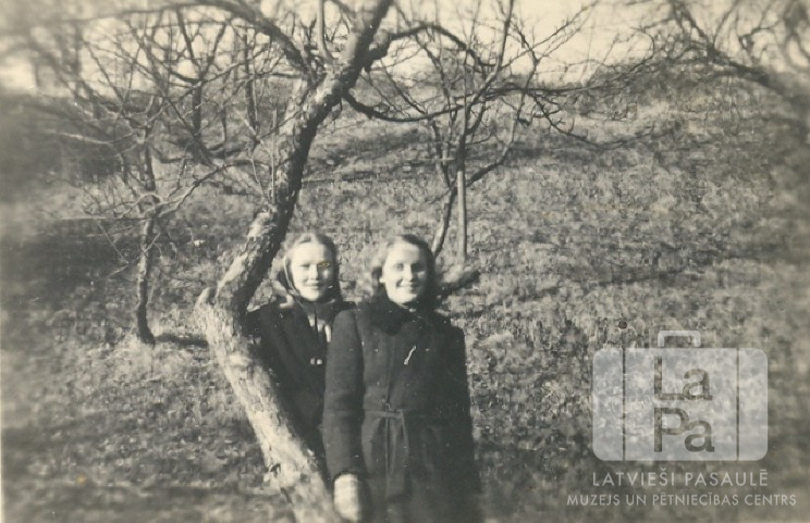 Divas meitenes mēteļos stāv pie kaila augļu koka Švābu Gmindē (amerikāņu zonā). Fonā vēl vairāki bezlapju augļu koki. No kreisās: Dagnija Antmanis un Valda Naruns. Foto autors: Genis Zelčs.