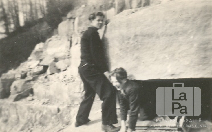 Divi zēni no Švābu Gmindes nometnes (amerikāņu zonā) pie lielas klints. Viens cenšas klinti pacelt, otrs rāpjas no klints apakšas ārā. Fonā, kreisajā pusē, mežs uz nogāzes. No kreisās: Genis Zelčs, Juris Lecis. Foto autors: Genis Zelčs.