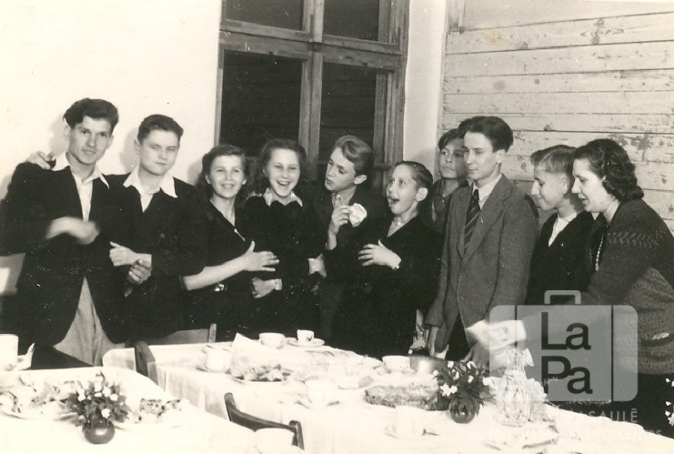 Manheimas pamatskolas 8. klases skolēni un skolotāja svinīgos tērpos pie galda Švābu Gmindē (amerikāņu zonā). Uz galda trauki, ēdiens un puķes vāzēs. Fonā logs. No kreisās: pirmais Genis Zelčs, trešā Larisa ?, piektais Edvīns (Otto) Tums, septītais Bruno Ogsts, astotais Juris Lecis, desmitā E. Eimane (klases audzinātāja). Foto autors: Genis Zelčs.