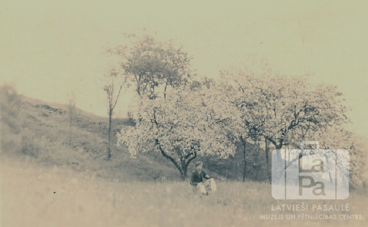 Genis Zelčs sēž zālē pie Švābu Gmindes (amerikāņu zonā) 1949. gada pavasarī. Viņam aiz muguras ziedoši augļu koki, aiz tiem ir neliela nogāze. Foto autors: Genis Zelčs.