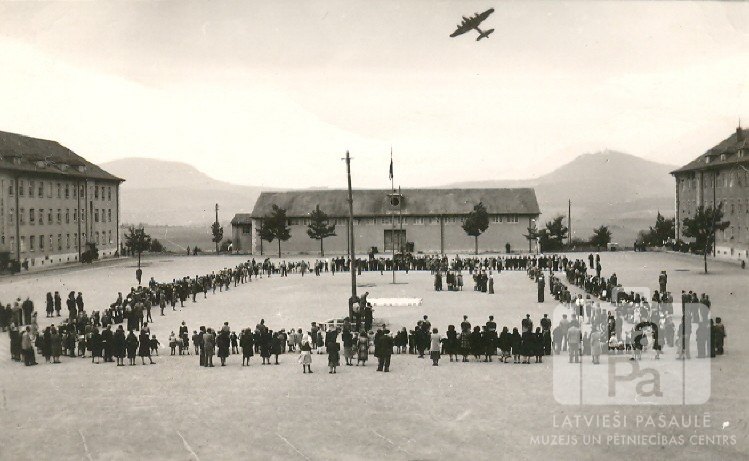 Sapulcējušies cilvēki Švābu Gmindes laukumā (amerikāņu zonā). Cilvēku rindas veido kvadrātu. Apkārt redzamas trīs mūra ēkas, fonā aiz tām divi kalni. Pāri lido lidmašīna. Foto autors: J. Šakalis. Par šo gadījumu Genis Zelčs atceras: "Skauti, gaidas un visi bērni ar dažiem pieaugušiem gaida ASV lidmašīnu, kura ir bildē pielikta. Lidmašīna lidoja tikai vienu reizi. Tas bija, lai mums būtu vairāk prieka saņemt kaut ko no gaisa – viņi droši vien domāja, ka bērniem būs liels prieks. Bet viņi nebija ievērojuši vēju. Mums bija noteikts, lai mēs stāvam kvadrātā ar baltiem palagiem pa vidu. Noteiktā laikā ASV lidmašīna lidoja mums pāri un meta dāvanas bērniem. Kad lidmašīna parādījās, sāka mest kaut ko, pie maziem izpletņiem piesietu. Nelaime bija tā, ka vējš visus izpletņus aizpūta aiz tās zāles, kuru redz galā. Tur netālu bija vācu lauki pilnā plaukumā, jo bija vasaras vidus. Dažas pakas atradām pie laukiem, un, uzzinot kas tajās ir, mums nebija vērts meklēt pārējās pakas vācu ražu laukos, jo tie lauki ietu bojā. Un tā lielā gaidīšana pārgāja ar ļoti lielu vilšanos. Viņi meta tādas lietas, kuras mēs bieži dabūjām no palīdzības (Care) pakām. "Care" palīdzības paciņas mēs saņēmām laiku pa laikam, varbūt kādas trīs vai četras reizes, kamēr bijām Švābu Gmindē. Lielākoties tajās bija ziepes, varbūt kāda šokolāde, zobupasta, zobubirstes, skolu vajadzības, kā zīmuļi un papīri. No tām pakām neviens neizdzīvotu. Neatceros, vai bija kāda ēdienu bundža. Parasti ģimene saņēma vienu paciņu, apmēram 20x20x20 centimetru lielumā. Tās bija mazas. Daudzi cilvēki nemaz tās neņēma, jo nebija vērts iekrāt sešas zobubirstes. Mūs baroja pietiekami, bet saldumi bija luksuss."