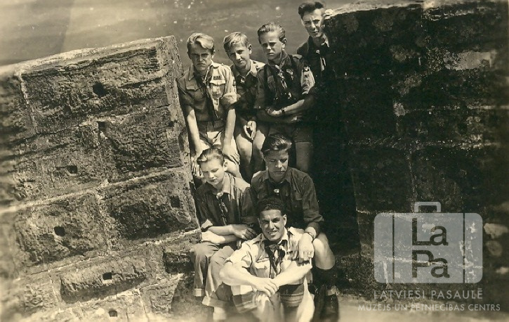 Skauti formastērpos viduslaiku pils tornī pie Švābu Gmindes (amerikāņu zonā) ap 1949. gadu. Attēlā, iespējams, ir skauti no Švābu Gmindes nometnes vai Kaibalas 66. skautu vienības skauti no Manheimas nometnes. Fonā, tālumā, redzami lauki. Otrā rindā, pirmais no kreisās: Gundars Strautnieks. Trešajā rindā, no kreisās: Edvīns (Otto) Tums, Aivars Petersons, Juris Dakters un Juris Lecis. Foto autors: Genis Zelčs.