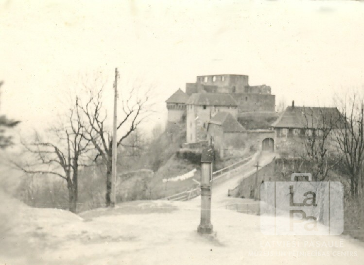Ceļš ar kokiem abās pusēs, priekšplānā akmens stabs, fonā pils ar tiltiņu.