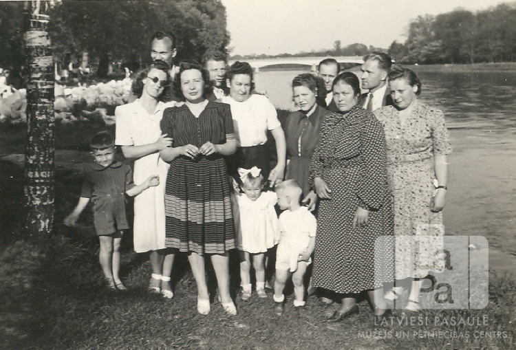 Pieaugušie ar bērniem no Dilingenes nometnes (amerikāņu zonā) svinīgos tērpos stāv blakus bērzam platas upes krastā 1950. gada vasarā. Priekšpusē divi mazi bērni gaišos tērpos, kreisajā pusē mazs zēns. Pieaugušie valkā kleitas un uzvalkus. Fonā abi krasti ir kokiem apauguši, un tālumā ir redzams gaišs tilts pāri upei. Foto autors: Genis Zelčs.