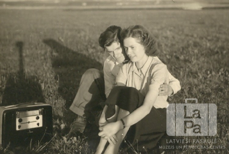 Divi jauni cilvēki no Dilingenes nometnes (amerikāņu zonā) sēž zālē uz liela lauka 1950. gada vasarā. Kreisajā pusē radio aparāts. No kreisās: Genis Zelčs un Tekla Drekslere. Foto autors: Genis Zelčs.